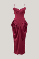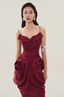 The Red Velvet Peg-top Midi Dress elegantly combines sophistication with modern design. Made from luxurious satin, this midi skirt features exquisite rose-wrapped detailing that adds a touch of romance and refinement. The peg-top silhouette design offers a flattering and contemporary shape, creating a timeless and stylish look.